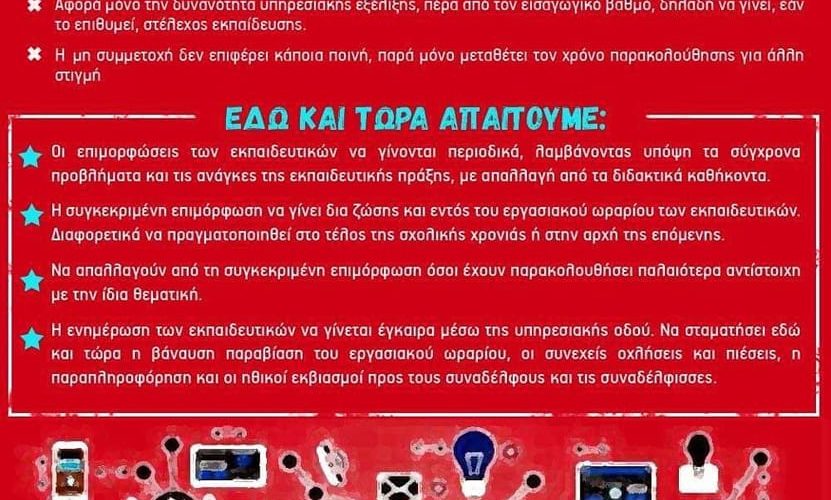 - Η ενημέρωση των εκπαιδευτικών να γίνεται έγκαιρα μέσω της υπηρεσιακής οδού. Να σταματήσει η βάναυση παραβίαση του εργασιακού ωραρίου, οι συνεχείς οχλήσεις και πιέσεις, η παραπληροφόρηση και οι ηθικοί εκβιασμοί προς τους συναδέλφους και τις συναδέλφισσες.