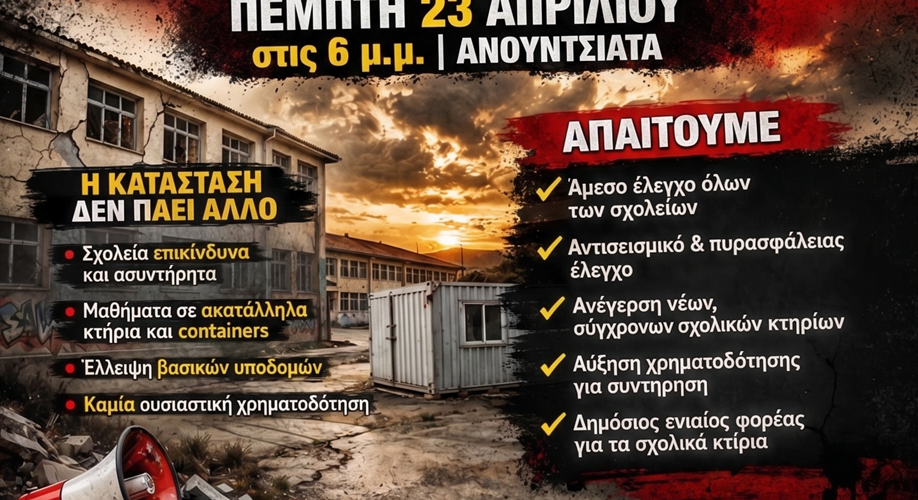 Χτυπάμε το καμπανάκι του κινδύνου προς όλους τους υπεύθυνους. Η κατάσταση των σχολικών υποδομών είναι ΕΠΙΚΙΝΔΥΝΗ. Μην παίζετε με τις ζωές των μαθητών και όσων δουλεύουν στους χώρους των σχολείων.